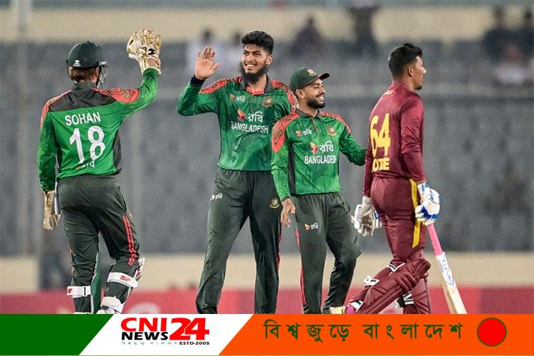 ২৯৭ রান তাড়া করতে নেমে বাংলাদেশের তিন স্পিনার নাসুম আহমেদ, সিরিজ সেরা নির্বাচিত হওয়া রিশাদ হোসেন ও তানভীর ইসলামের ঘূর্ণিতে পড়ে ৮২ রানেই ৮ উইকেট হারায় ওয়েস্ট ইন্ডিজ।